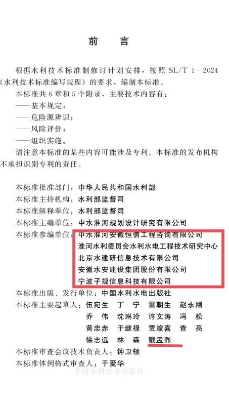 近日,國家水利部正式發布行業重要標準《水利水電工程危險源辨識與風險評價導則》(SL/T843一2025)。寧波子規信息科技有限公司作為唯一民營企業參編單位,為該標準的成功制定提供了技術支撐與實踐經驗。公司選派以戴孟烈董事長為首的專家團隊,全程參與了導則的起草與評審工作,其專業見解與貢獻獲得了編制組的高度評價。